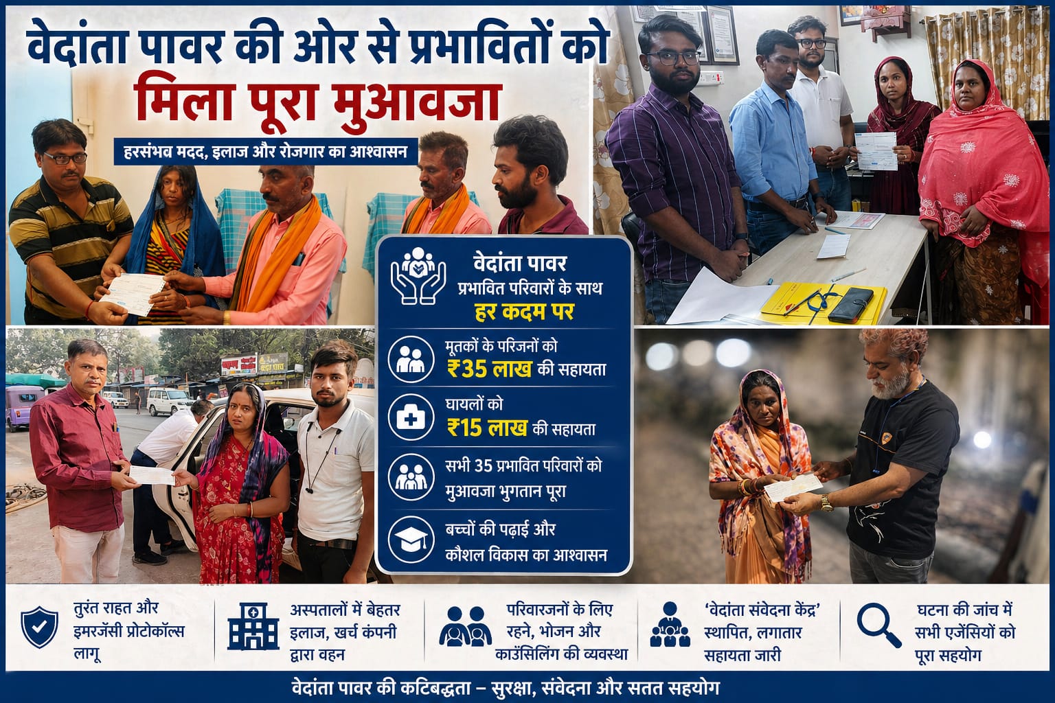 वेदांता लिमिटेड की पावर इकाई में हुए भीषण हादसे के बाद कंपनी ने प्रभावित परिवारों को मुआवजा देने की प्रक्रिया पूरी कर ली है। कंपनी के अनुसार, मृतकों और घायलों के परिवारों को पूरी आर्थिक सहायता प्रदान कर दी गई है और हरसंभव मदद जारी है।