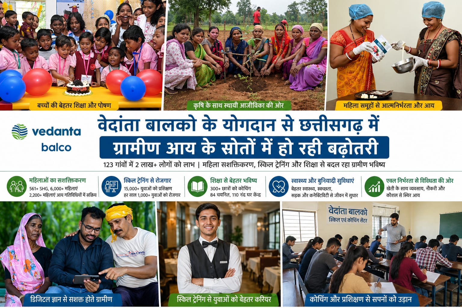 छत्तीसगढ़ में वेदांता बालको के प्रयासों से ग्रामीण आय के नए स्रोत बन रहे हैं। महिलाओं के SHG, स्किल डेवलपमेंट और शिक्षा कार्यक्रमों से हजारों लोगों को मिला फायदा।